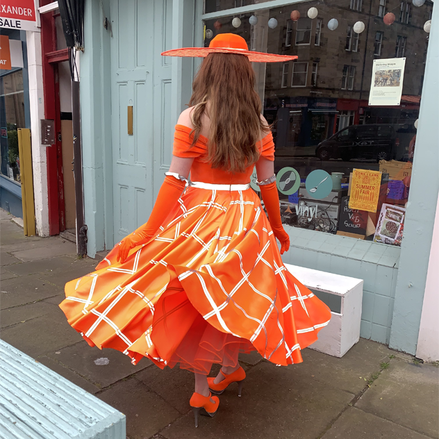 After the initial design project we were assigned a date (1950) and a colour (neon orange) to redesign the play for. From my research into 1950 I decided this interpretation would be based on 1950s Hollywood and took inspiration from clothing from films set in 1950. I then created the costume for my design of Medea, sewing a dress and petticoat, creating a hat, and ironing reflective strips on to the skirt.